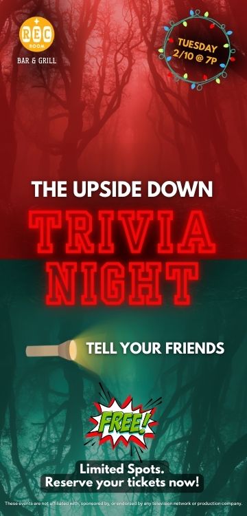 Think you know The Upside Down? 👀Prove it at TRIVIA NIGHT at our bar & grill, The Rec Room